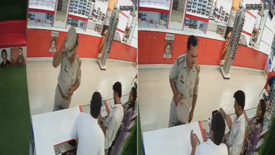 Screengrab A police inspector in Mirzapur, Uttar Pradesh, was caught on CCTV allegedly threatening an optical shop owner and leaving