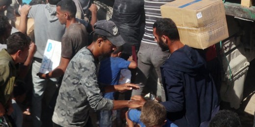 Palestinians crowd onto aid trucks moving through Gaza